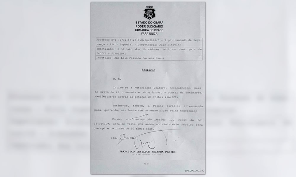 O juiz Francisco Ireilton Bezerra Freire, através de despacho publicado nesta terça-feira, 27/03, intima a Prefeita de Icó, Laís Nunes, para cumprir, em 48 horas, a partir da notificação, a liminar que garante a realocação de 362 professores em suas ampliações de carga-horária.